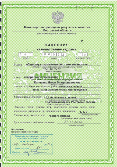 Усьманское Южное месторождение песков находится в Багаевском районе Ростовской области в 20 км юго-западнее районного центра – ст. Багаевской. Ближайшим населенным пунктом является хутор (х.) Усьман. Лицензионный участок расположен в 1,0 км к западу от его окраины, с западной стороны автомобильной дороги, ведущей на трассу Ростов-на-Дону – ВолгодонскПо условной международной разграфки площадь лицензионного участка входит в пределы листа L-37-XI геологической карты России масштаба 1:200000 и имеет следующие координаты центра: 47009′18,53′′ с.ш. и 400 16′24,70′′ в.д.