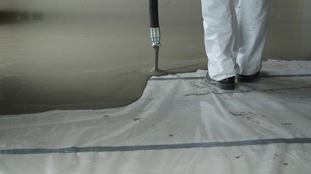 Перед финальной отделкой пола, установкой системы подогрева поверхность заполняют раствором бетона или цемента, который сохнет почти месяц, когда формируется мокрая стяжка, что укладывается на перекрытие, на почву, гидроизоляцию. Перед заливкой смеси по периметру помещения укладывают демпферную ленту и утеплитель.